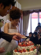 おふたりは同じ中学校の同級生!なので、出席されるゲストは4分の一が中学時代の同級生!!とっても和やかな雰囲気で始まった人前式とウェディングパーティー♪みなみさんのオナカには、8カ月になる可愛い家族がいるので、ウェディングケーキにはお二人のイチゴ人形と一緒に赤ちゃんのフランボワーズ人形が!