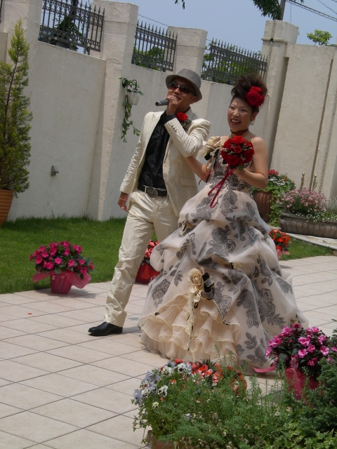 ガーデンからお色直ししたあつおさんとじゅんこさんが登場し、びっくり入場!更にあつおさんがマイクを握って歌いながらの入場です。
