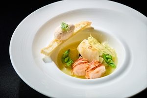 貝の出汁とキャベツのナージュソース、生ハムのリエットも添えてあります